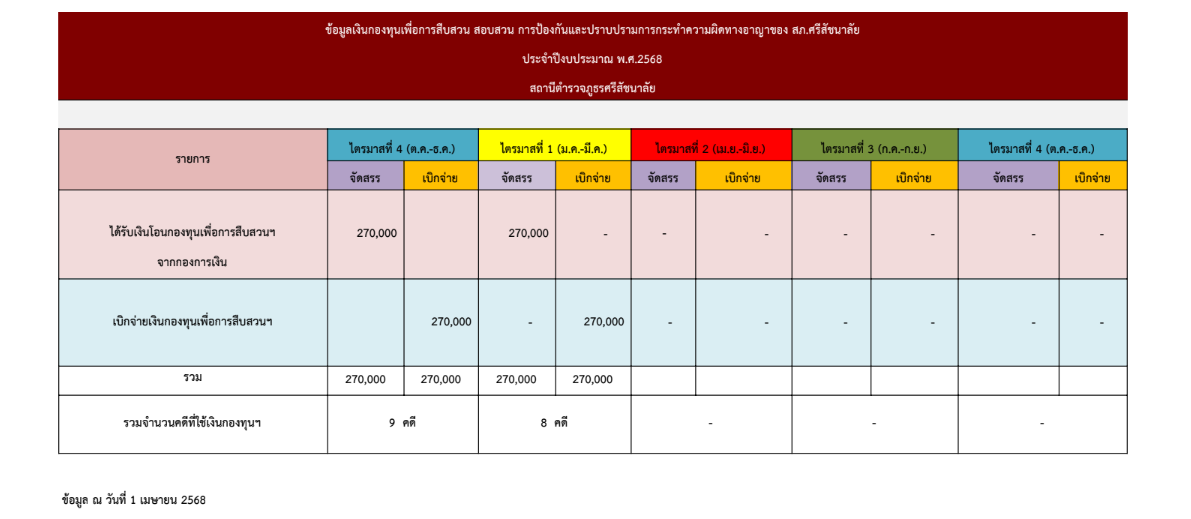 สถานีตำรวจภูธรศรีสัชนาลัย ได้แสดงข้อมูลเงินกองทุนเพื่อการสืบสวนสอบสวนการป้องกันและปราบปรามการกระทำผิดในคดีอาญาที่สถานีตำรวจภูธรศรีสัชนาลัย ได้รับการจัดสรรและ การใช้จ่ายเงินกองทุนฯ ในรอบ 6 เดือนเเรกหรือ 2 ไตรมาส ของปีงบประมาณ 2568 แต่เนื่องด้วย เงินกองทุนฯได้รับจัดสรรเป็นปีปฏิทินจึงสามารถเผยเเพร่ได้ ในรอบ 3 เดือน มีดังรายละเอียดล่างนี้