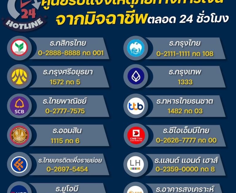 ธนาคารทั้งสิ้น 12 แห่ง ได้เปิดศูนย์รับแจ้งเหตุภัยทางการเงินจากมิจฉาชีพของธนาคาร
