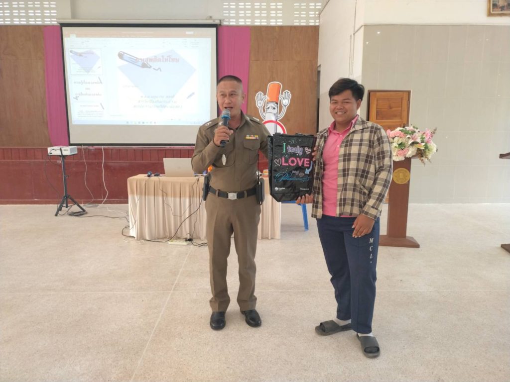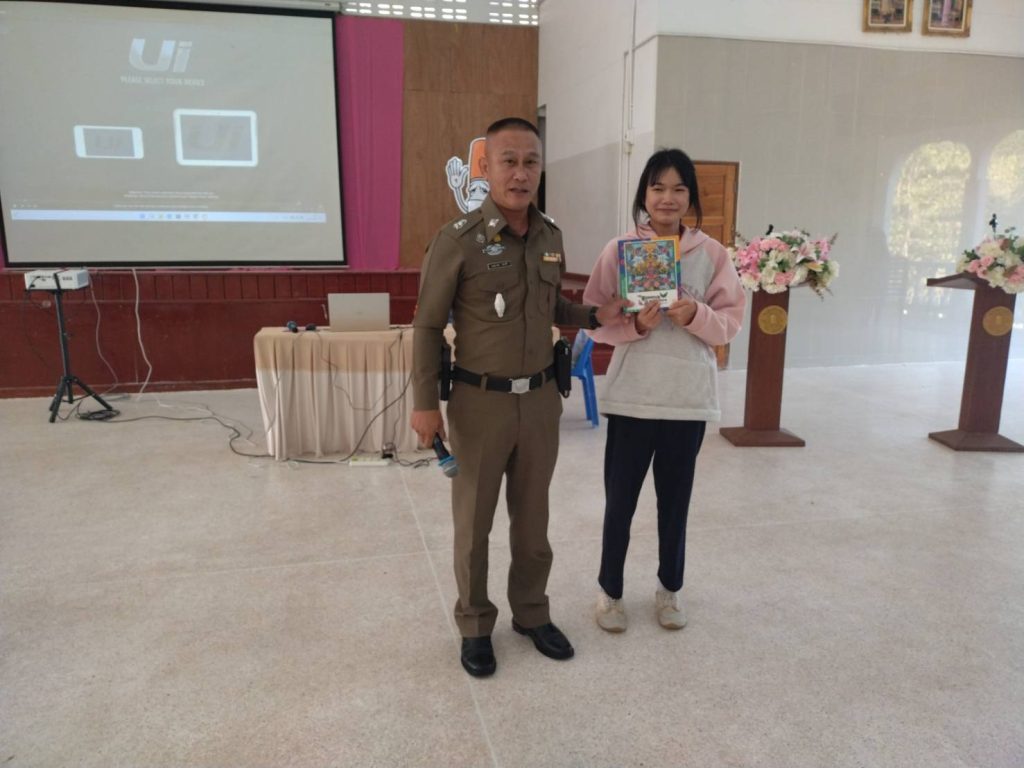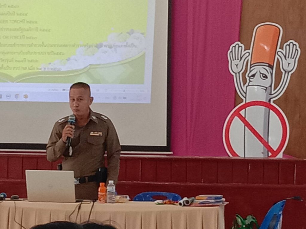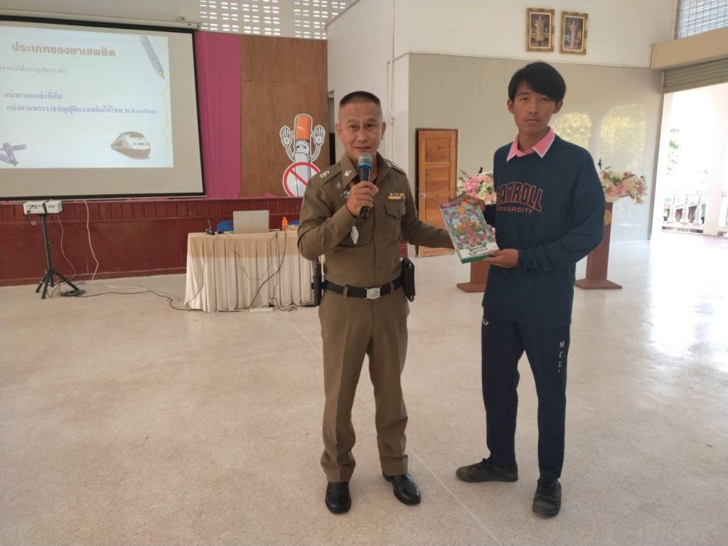 พ.ต.ต.นฤนารถ ทองดี สวป.(ชส.)สภ.ศรีสัชนาลัย ได้เป็นวิทยากรให้ความรู้เรื่องยาเสพติดให้กับนักเรียนโรงเรียนเมืองเฉลียง จำนวน 100 คน
