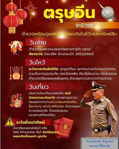 พ.ต.อ.ศิรพงศ์ เกิดคุณากร ผกก.สภ.ศรีสัชนาลัย มอบหมายให้ ร.ต.อ.หญิงประภาพร นักสิทธิ์ รอง สว.ฯ รรท.สว.อก.สภ.ศรีสัชนาลัย พร้อมข้าราชการตำรวจชุดจิตอาสาและข้าราชการตำรวจจราจร จัดกิจกรรมจิตอาสาประชาสัมพันธ์รณรงค์ป้องกันอัคคีภัยช่วงเทศกาลตรุษจีน