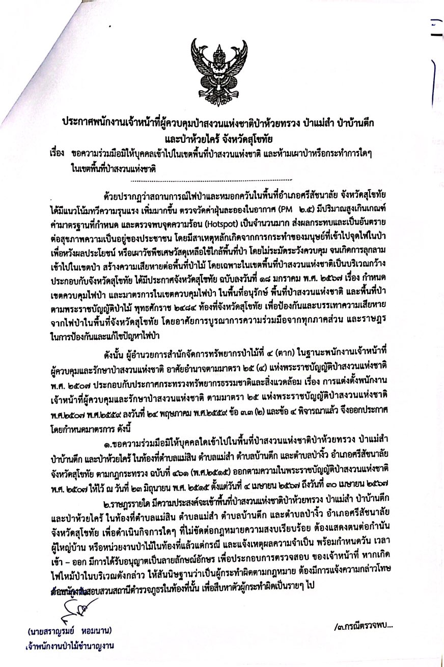 ประชาสัมพันธ์ ขอความร่วมมือมิให้บุคคลเข้าไปในเขตพื้นที่ป่าสงวนแห่งชาติ และห้ามเผาป่าหรือกระทำการใดๆใ